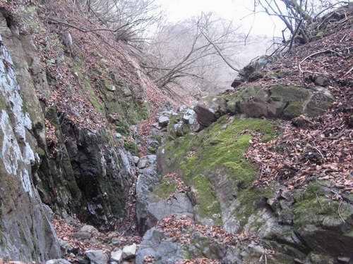沢を忠実に最後まで詰めると最終部に2m、3m程の涸棚があるけども、そこさえも最後まで無理に突入するから、あるという程度で、普通に言えば障害物はなく、小石がコロコロする歩き易い沢といっていい。