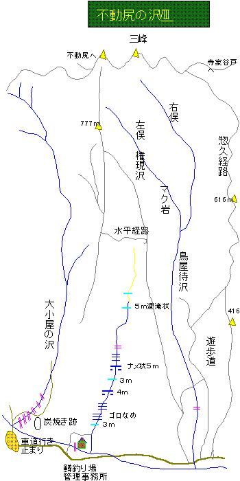 谷太郎川鱒釣り場入り口の駐車場に立てかけてある河川表には「鳥屋待沢」と「大小屋ノ沢」との間に水色で明瞭に一本の沢が示されている。