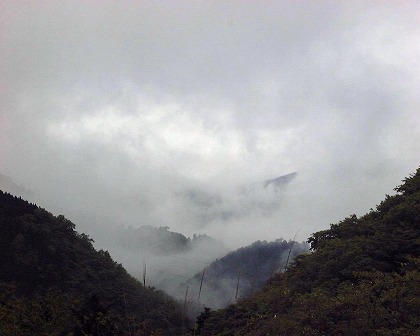 物見隧道の出口に自転車を止めて、雨上がり靄のかかる唐沢林道を歩いて下る。