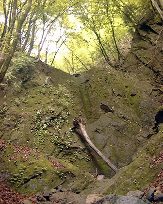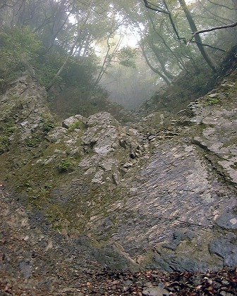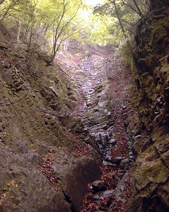 別れた分岐のまず左に入って4m程のスラブ滝をすぎ、さらに200m程進んでチムニー状の4mをのっこし、稜線に向かって沢が更に継続しているのを見定め、