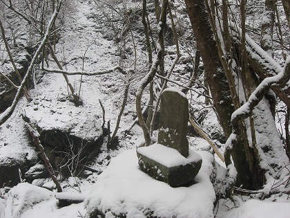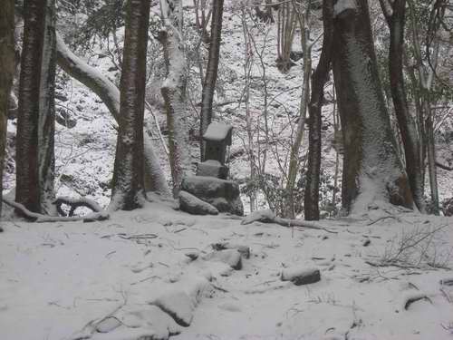 川の流れの水音は10mも離れると空間に吸い込まれて雪の中の石祠は寂しい。