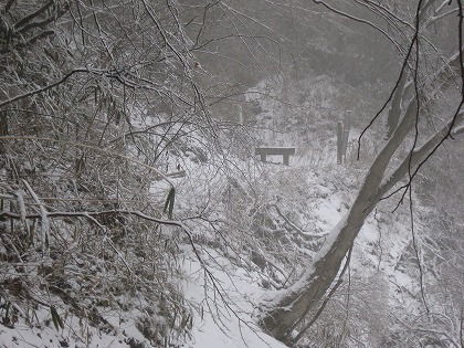 煤ヶ谷でバスを降りたときには、細かな雨のような雪のようなみぞれ状態だったが、山の中に入ると、程なく雪に変わった。