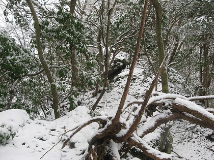 斜面は直ぐに小尾根状に変わるが、曲がりくねって這える馬酔木の葉っぱに雪がへばりついていて揺するとバラバラと落ちて来て首筋から入り込むので、それを何とか避けようとすると枝を払うのが煩わしい。