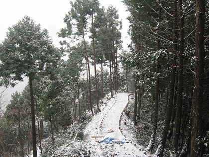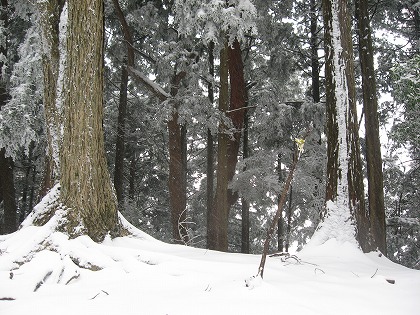 杉の林の中を、雪に覆われてからこそハッキリする踏跡を登る。