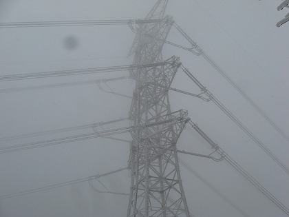 送電線は前も後ろも一つ先の鉄塔までは何とか分かるが、その先は空の雪に吸い込まれてしまっているようにして見えない。