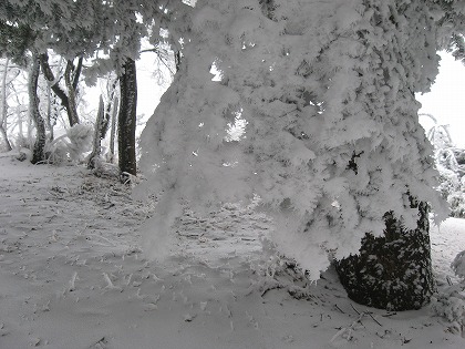 そんなだから、下では軽く触っただけでバラバラと落ちてきていた木に付く樹氷や葉の上の雪も、ここではガチガチに固くこびり付いているようで、軽く揺するくらいでは欠片も落ちてこない。