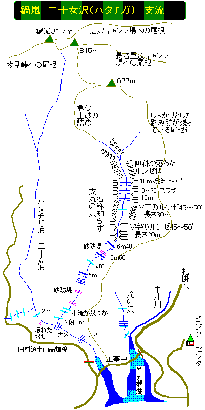 普通、二十女沢に行くには途中までは20女沢のかなり上流まで行っているハタチガ林道を終点まで詰めるが、今回は工事中の出会いから沢に入る。