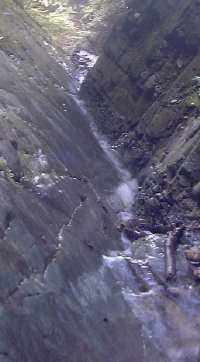 でもこれが目指す沢なのか自信がもてないのでそのまま本流を進み、壊れた堤防をすぎ、2mの小滝を越したところでハタチガ沢の下部の滝地帯入り口に立ってやはり先ほどの流れで良いことを確信した。
