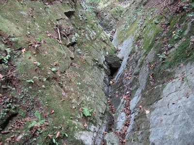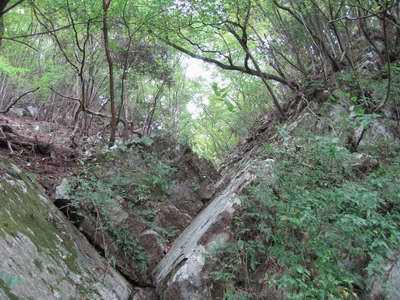 しかし、きつい傾斜と灌木で岩の概要が伺えただけであり、沢に戻っても、先ほどの岩が見える地点まで下降することはままならず、そのまま上を目指したのが前回だった。