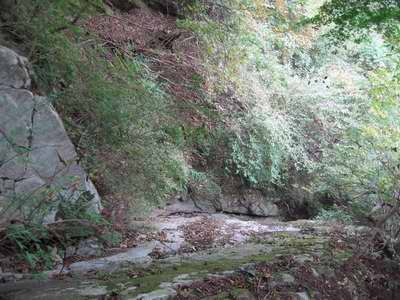 これで傾斜がきついと面倒な登りになるが、傾斜度は40°程度と緩いので、左岸のつるつるには足をかけないでもV字の底に靴をつっこめば、それが楔になり、簡単に登れる。
