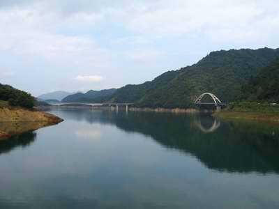 猿ヶ島の突端から対岸を眺める 正面左は山びこ大橋 右は大棚沢橋