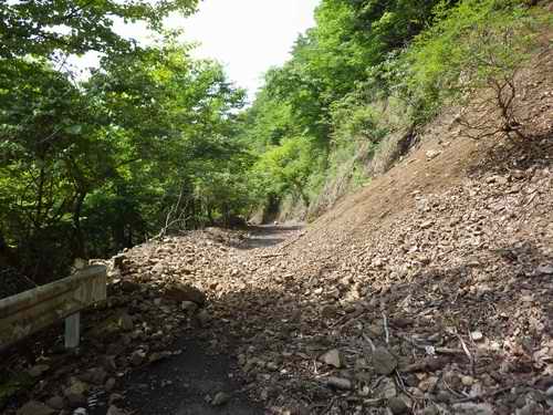 終点近くになると、土石が路面を覆い尽くしていて自転車では走れなくなる。