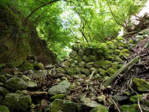 石積みは斜面が掘れるのを防いでいて、その石積みから50m程登ると宮ヶ瀬尾根の稜線(標高520〜530mの鞍部)に乗る。