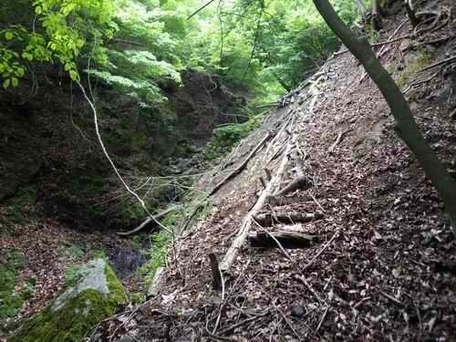 左の方が少しだけ水が多いからと入ってみたが、傾斜は急ではあるが滝はない。