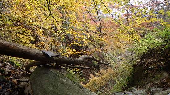 続く平板スラブは通常は左隅の樋、もしくは右につながる平板を登るが、巻きとは情けないと泣きつつ右から巻く(境界杭あり)