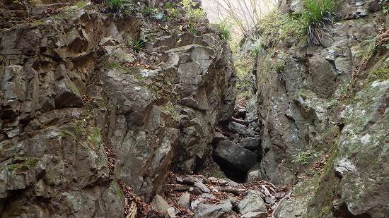 そこを抜けると左に曲がった狭いルンゼ状は幅を広げた砂場に変化して上の稜線に向かって突き上げる。