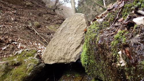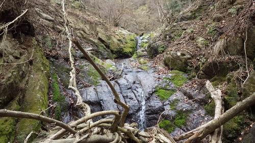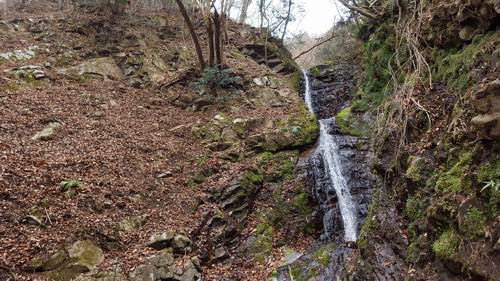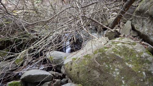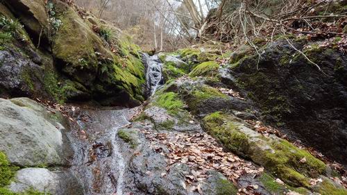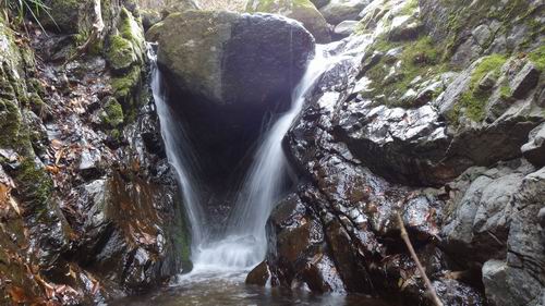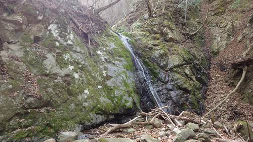 足元の倒木を踏んでいる間に一端視界から消えたが、左から沢に出っ張った岩を通り過ぎ目の前が滝となっても、なお倒木を20m程踏む。
