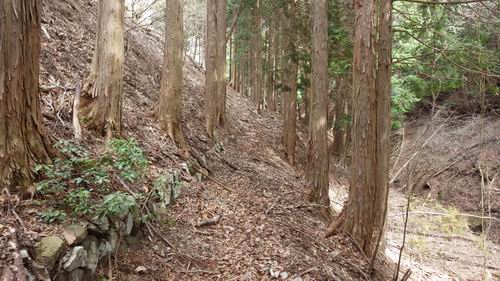 枯れた鈴竹をバリバリと払い30m程行くと杉の林の中に道らしいのが見えてくる。
