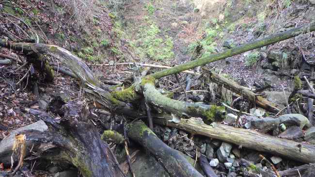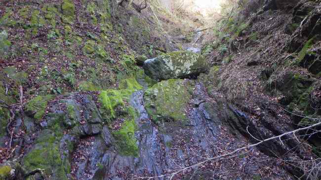 小石に埋まりそうな低めのCSが一つあり、古い丸太が止めて小堤となった2mくらいの段差を越えると奥10mに幅80cmの閂部がある。
