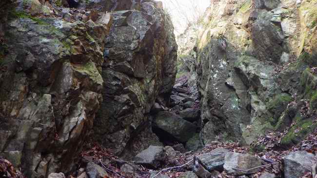 岩溝は全体は直線ではあるが、細かく曲がっていて、入り口で分かるのは10m先くらいまでの範囲であり、入口下から出口までが百mくらいだが、一気通貫には見通せない。