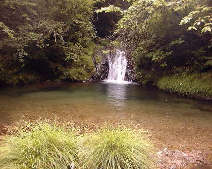 砂防堤の上で右に分かれた沢は早速、小さな釜を持った憂鬱な1.5mの簡単な滝で出迎えてくれ、その上はナメ、小滝と続き、最初の滝と同じような小さな釜のある3mは右側から登ると砂防堤となる。