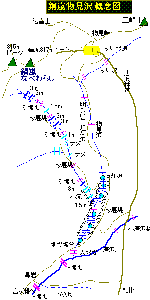 自宅5:50〜物見隧道6:50〜丸淵7:10〜尾根道8:35〜鍋嵐8:44〜物見峠9:05〜隧道9:10〜自宅9:50(自宅で朝御飯を食べる) 2000/06/03