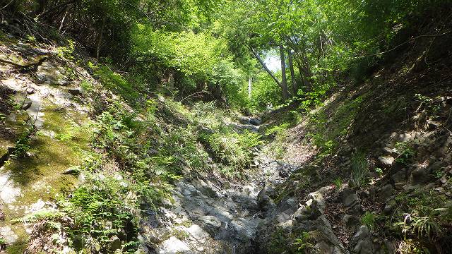 仕事道が沢沿いに延び、石積みの堰堤を三つほど超える。