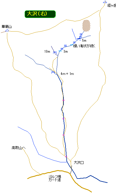 華厳山への登山道に入り、大沢を渡ってすぐ、尾根に向かう登山道を左に分けて大沢(右俣)に入る。