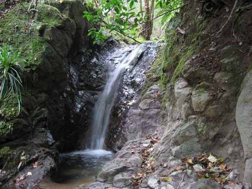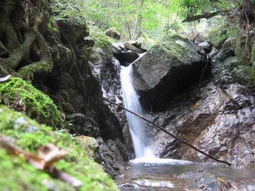 目をこらすと水が白っぽく見えて、さあと斜面を滑り降りると3mと小さいけれど滝がちゃんとあった。