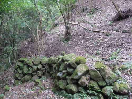 斜面に上がっていく仕事道(手前は炭焼窯跡)