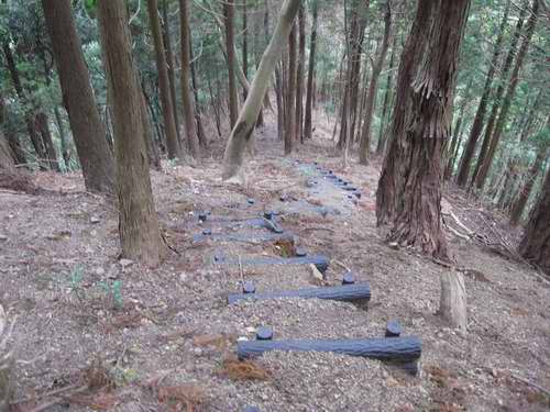 登山道入り口では登山道とは別に右側に経ヶ岳方向に登っていくと思われる木製土留め階段道が着いていた。
