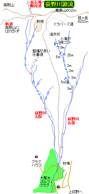 ゴルフ場中を流れる荻野川沿いの砂利の市道を華厳山方向に歩いていくと一番奥のホールの手前で川は右に曲がって山に入っていく。
