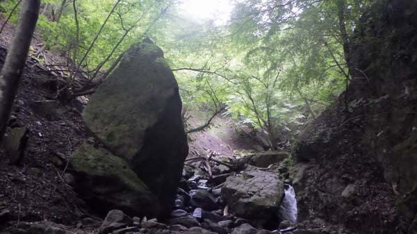 そんなようにして進んでいくとピナクル大岩が沢床左側に立っている。