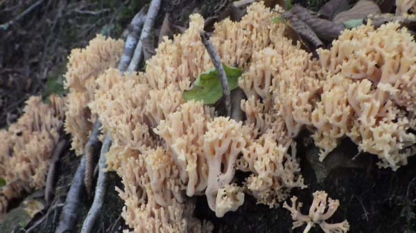 尾根上にはホウキタケ(有毒のものである可能性もあるが見分け能力無し)が何箇所かに群生していて、目に入った物を集めたならば70gのザルが満杯になるであろうが、歩くのに邪魔なので踏み散らして行くのみだった。