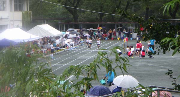 子供等が濡れるので、面倒見る先生方は気がもめて大変だろうが、子供達にとって雨の運動会は印象深いものとなるだろう。