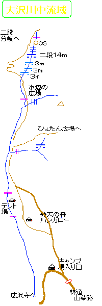 下を石積み堰堤でせき止めて出来た砂場の「水辺の広場」から右岸に続く遊歩道に別れ、沢沿いに進むと、3m、3mと簡単なナメが続き、左に少し折れ曲がると3mの平板な滝になる。