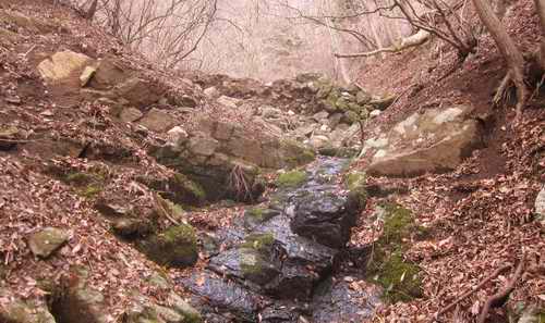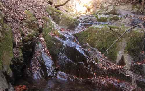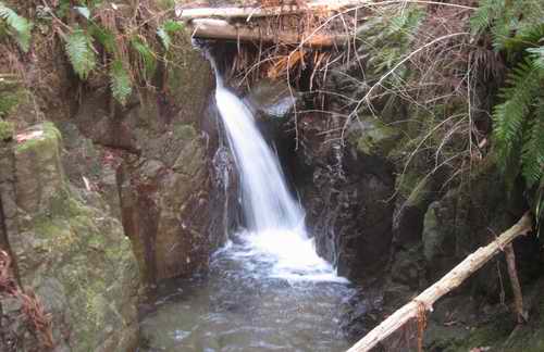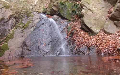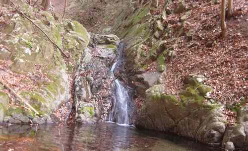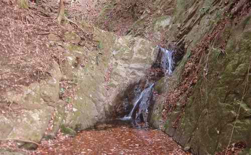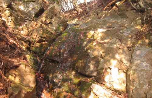 キャンプ所内の杉林の小道(登山道)の脇に小滝が一つ見える。
