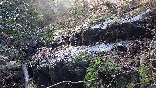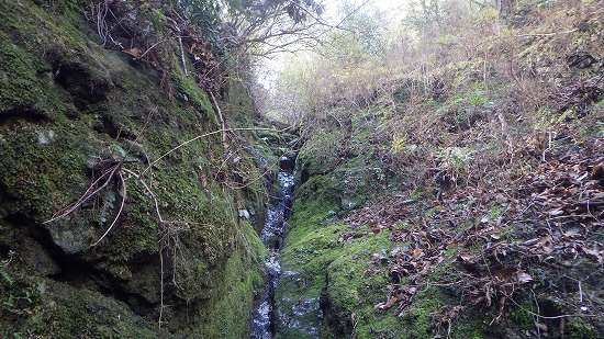 段の間から水がしみ出して落ち、それがこの沢を流れるわずかばかりの水の源になっているらしい。
