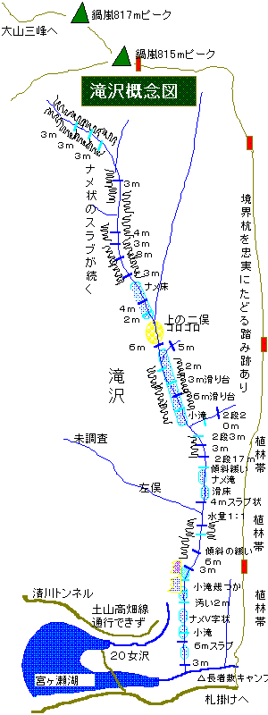 滝の沢は昭文社のエリアマップには境沢と表記されているが、ボクの持っているブルーガイド(昭和49年版)には滝の沢となっているので、この名称で表記する。