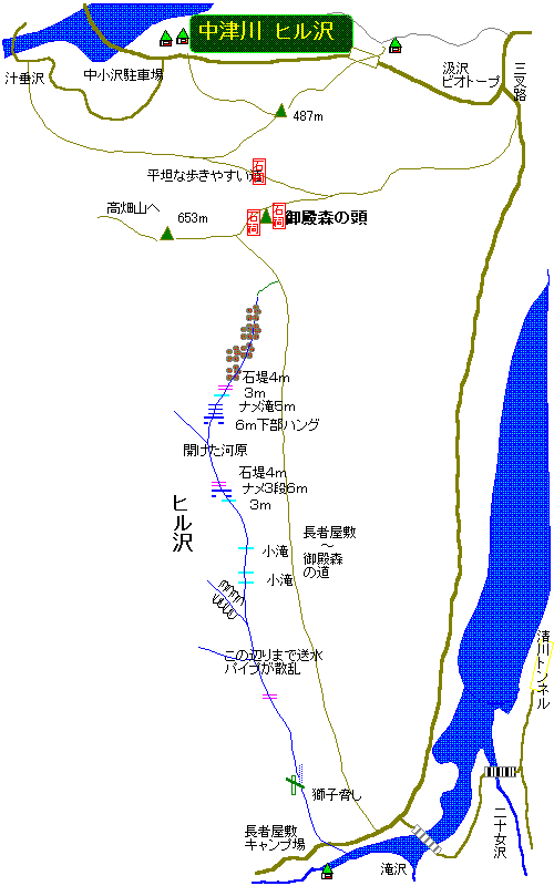 ヒル沢も長者屋敷キャンプ場の飲料水をこの沢から引き込んでいることもあってか中流域まではしっかりした道があり、更にその奥も稜線に抜けて御殿ヶ森に至るまで沢沿いに道が続いている。