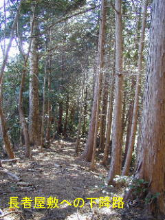 大石をすぎていくらも行かないうちに沢は形を無くし、杉の植林帯に突入し、次に落葉樹帯を暫く歩いて高畑山0.2kmの標識のある遊歩道に出る。