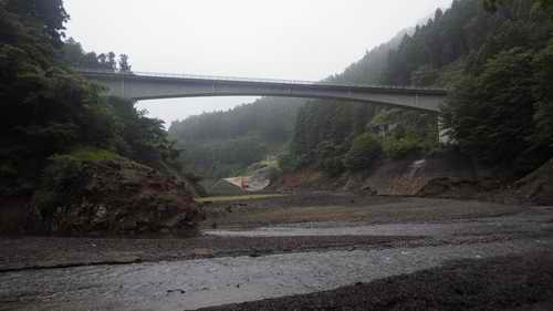 上流は当然ながら下流方向にだって湖面は遠くに小さく、橋の下は一面の砂地の河原、中津川は二筋に分かれて各々幅4mほどの浅く流れている貧弱な川だ。