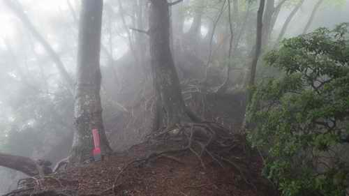 とか何とか言いながら、ついでに息継ぎ休みを時々入れて、ラストの霧の湿気に滑り感を増した泥壁は木の根っこを頼りにするが、足元は泥どろ粘土状だから、腕だけが頼りの登りだったして、梅雨の時期の沢の詰めは結構やばい。