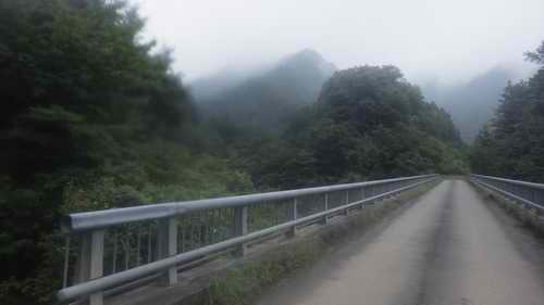 霧の流れるハタチガ沢沿いの林道を下る。