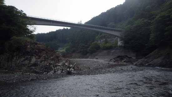 予想通りに湖の水は15号橋の下流側で止まり、降ったら小石の堆積した広い河原となっていて、その中を中津川が涼しやかに流れている。