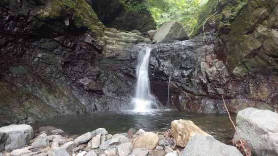 岩床とは言え平坦/平滑ではなく、小さくゴツゴツした黒い表面の岩が、緩い傾斜面の間に浅い水たまりを構成していて、左右の山側斜面も岩床に続いた大きく開いたV字状だ。