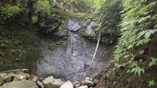 遠目には「即・巻き」とも考えるが、周囲を見渡せば、岩床から左右斜面までが一体となっているので簡単に滝を避ける方法は近くには見あたらない。