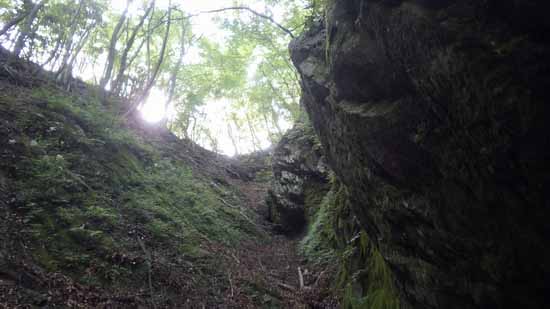 岩床が尽きると井戸の底に立つ感じの狭く急なルンゼの上に稜線を見上げることになる。
