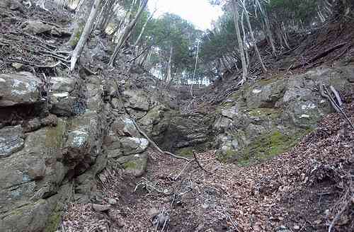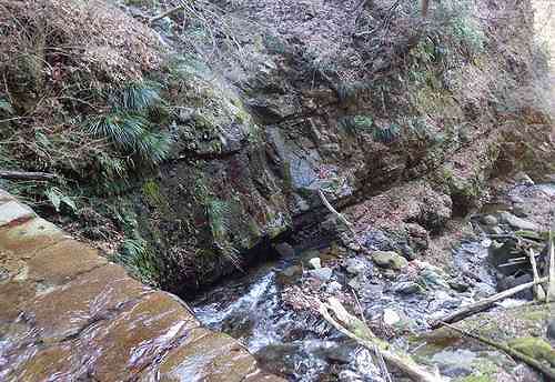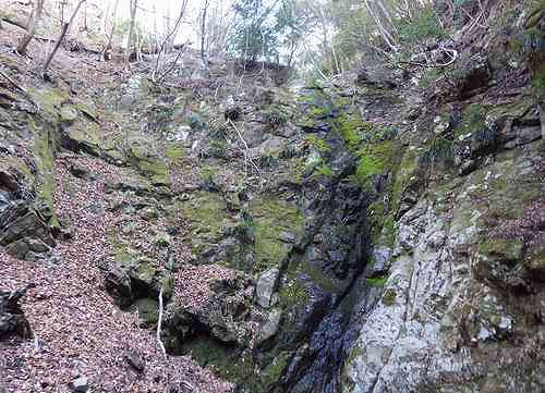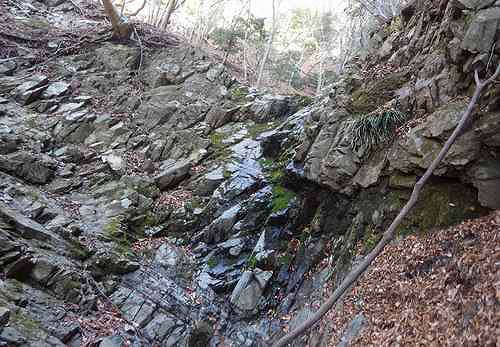 その歩き始めの次の砂防堤の下に境界尾根側から5m程の岩場がある。