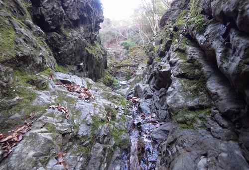 両岸が狭まって厳しいゴルジュでも出てきそうな雰囲気があっても、岩床はあくまでも易しく、気を付けなければならないのは枯葉の堆積に隠された水溜まりに足を取られて水没することくらいだ。
